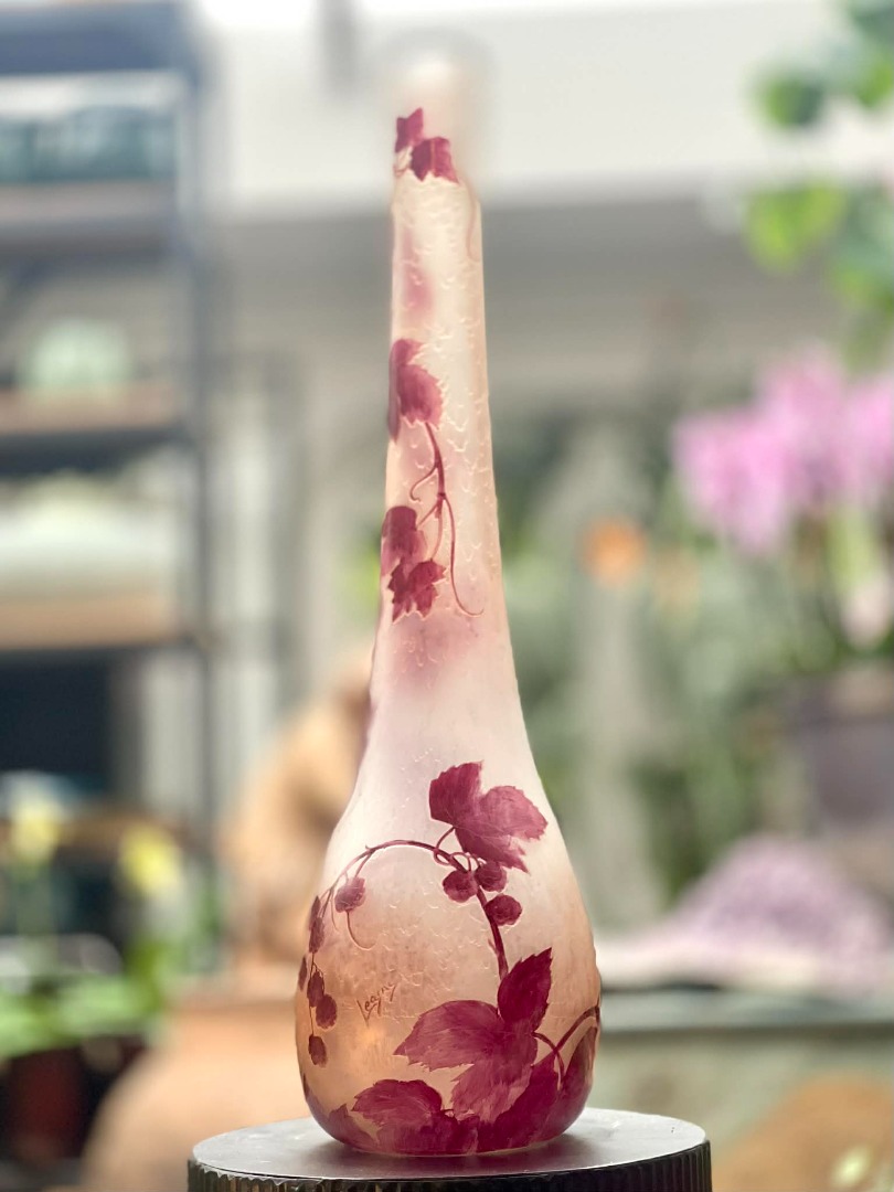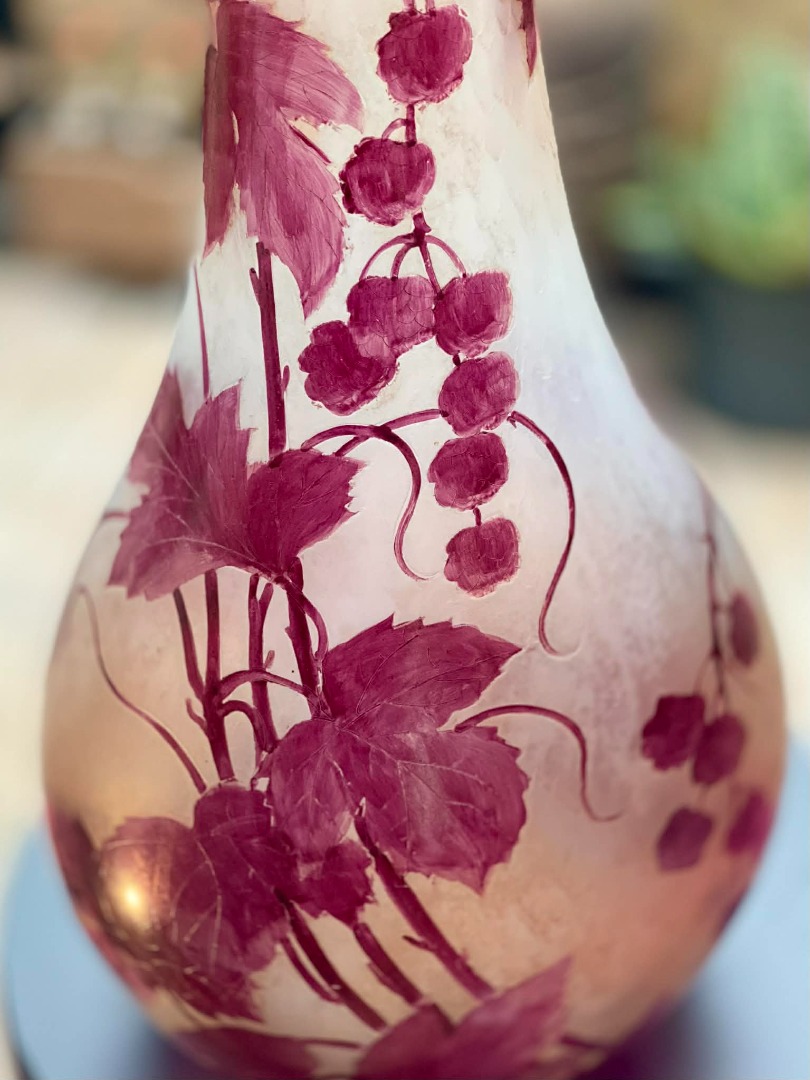 Een uitzonderlijke originele Art Nouveau vaas van de beroemde Franse glasfabriek Legras, daterend uit het begin van de 20e eeuw. Deze indrukwekkende vaas is uitgevoerd in gematteerd (zuur-geëtst) glas en met de hand beschilderd met een verfijnd botanisch decor van hopranken en hopbellen (décor houblon), een geliefd motief binnen de Art Nouveau.