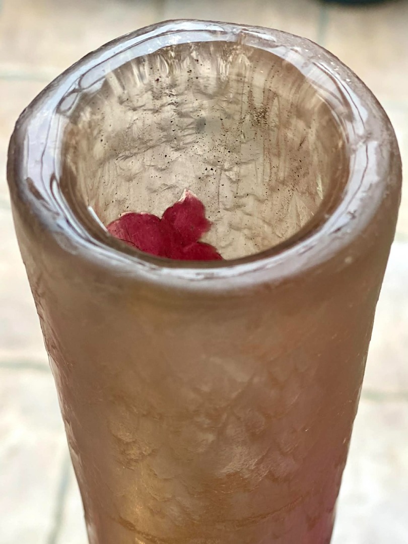 Het glas heeft een subtiele opaalachtige wit-roze kleuring, die prachtig reageert op licht en zorgt voor een zachte, bijna poëtische uitstraling. De lange slanke hals en het peervormige lichaam geven de vaas een elegante, sculpturale vorm. De vaas is handgesigneerd “Legras”, wat de authenticiteit en herkomst bevestigt.