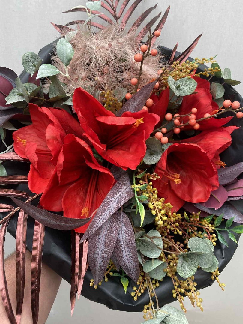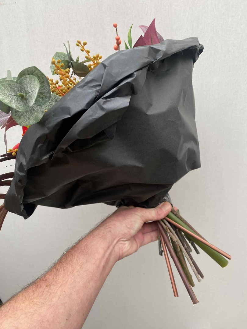 Dit fraaie boekt is van zijde bloemen, het boeket is hand gebonden en kan in een vaas worden geplaatst. de stelen zijn met een draadtang op de gewenste lengte te knippen.