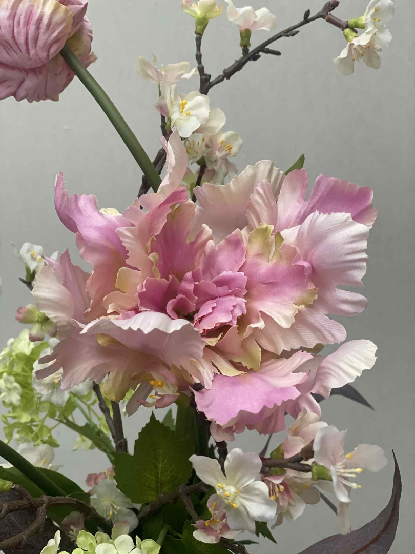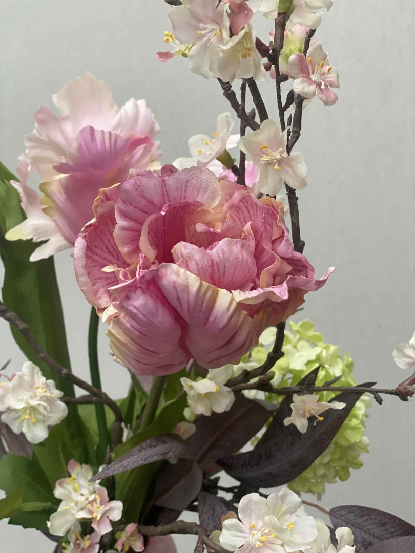Dit fraaie Bloemstuk is volledig van zijden bloemen gemaakt. Onze bloemstukken worden in eigen atelier gemaakt. Iedere bloemstuk is handwerk.