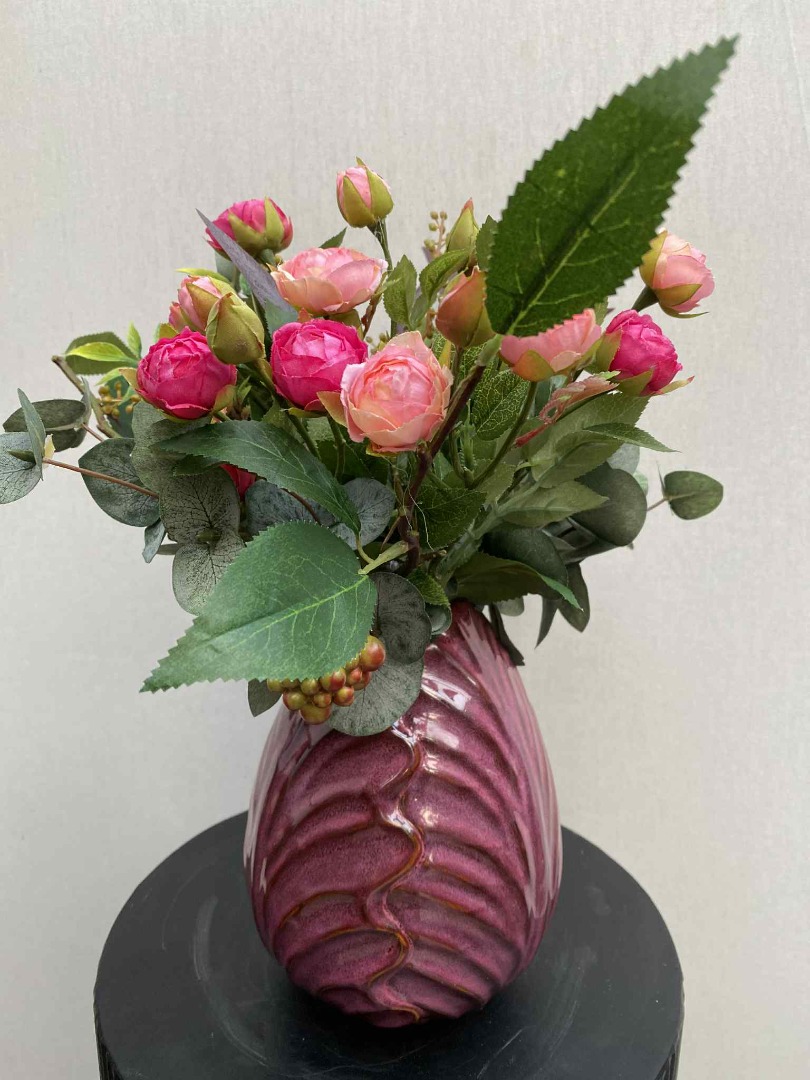 Dit fraaie Bloemstuk is volledig van zijde bloemen gemaakt. Onze bloemstukken worden in eigen atelier gemaakt. Iedere bloemstuk is handwerk.