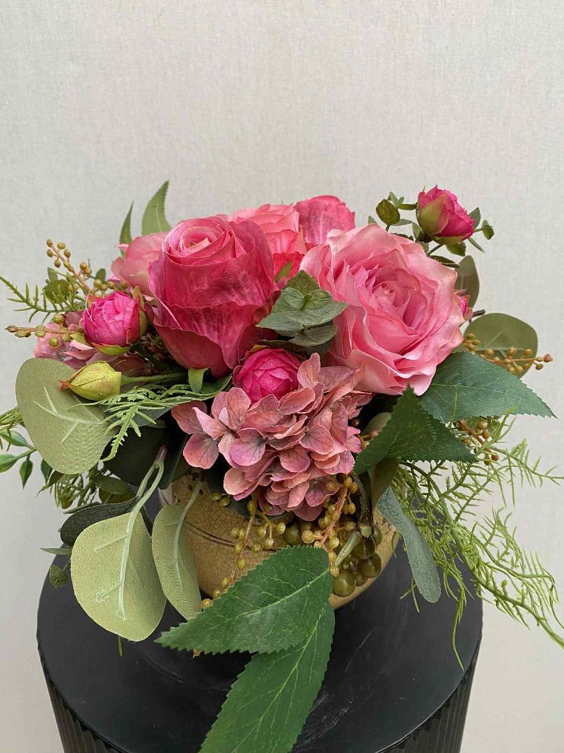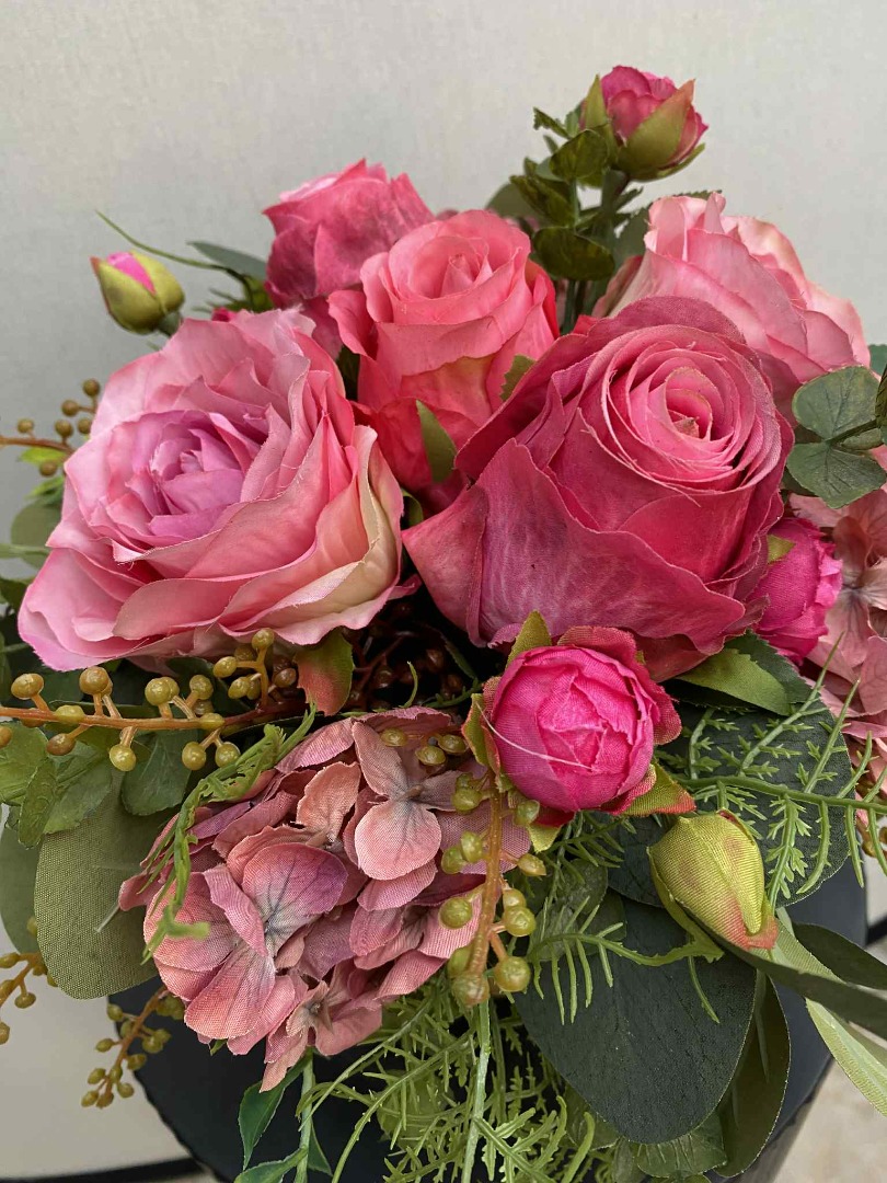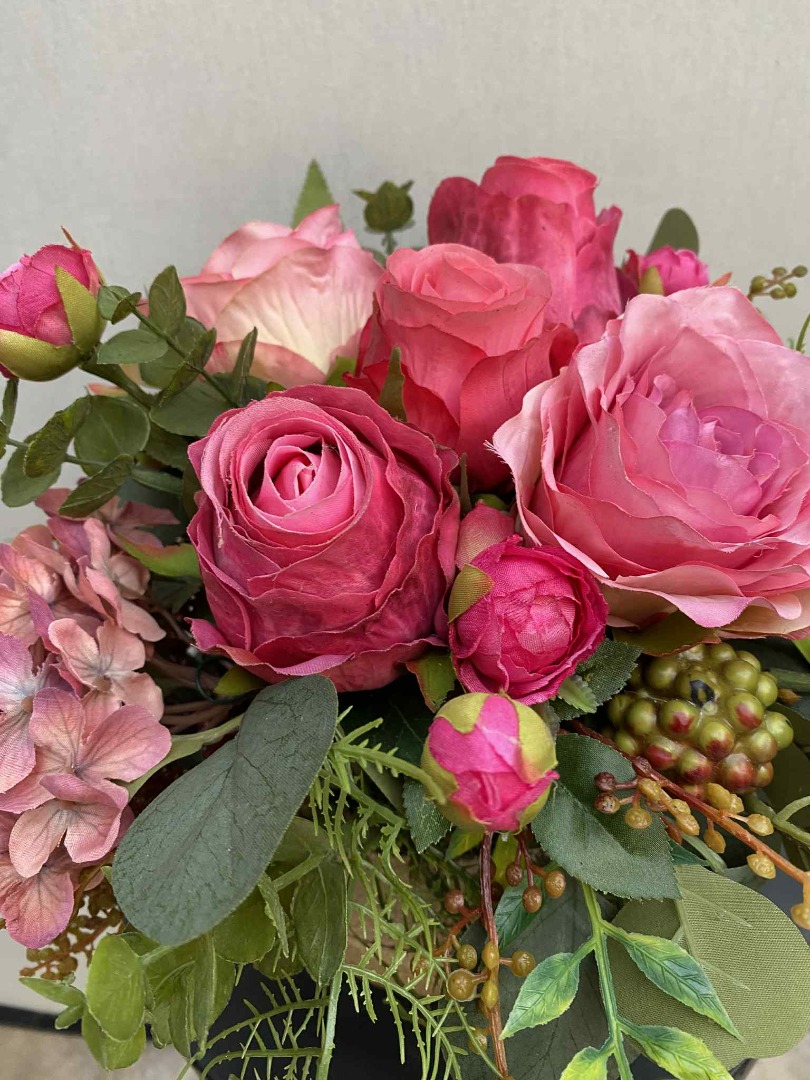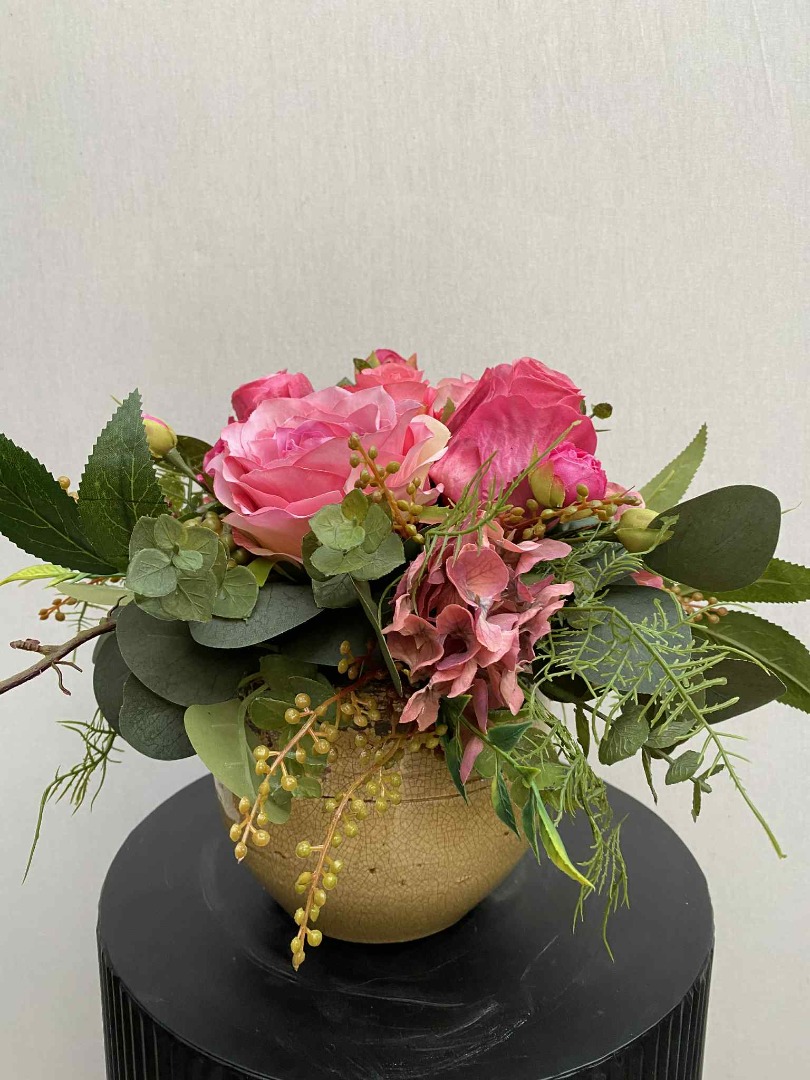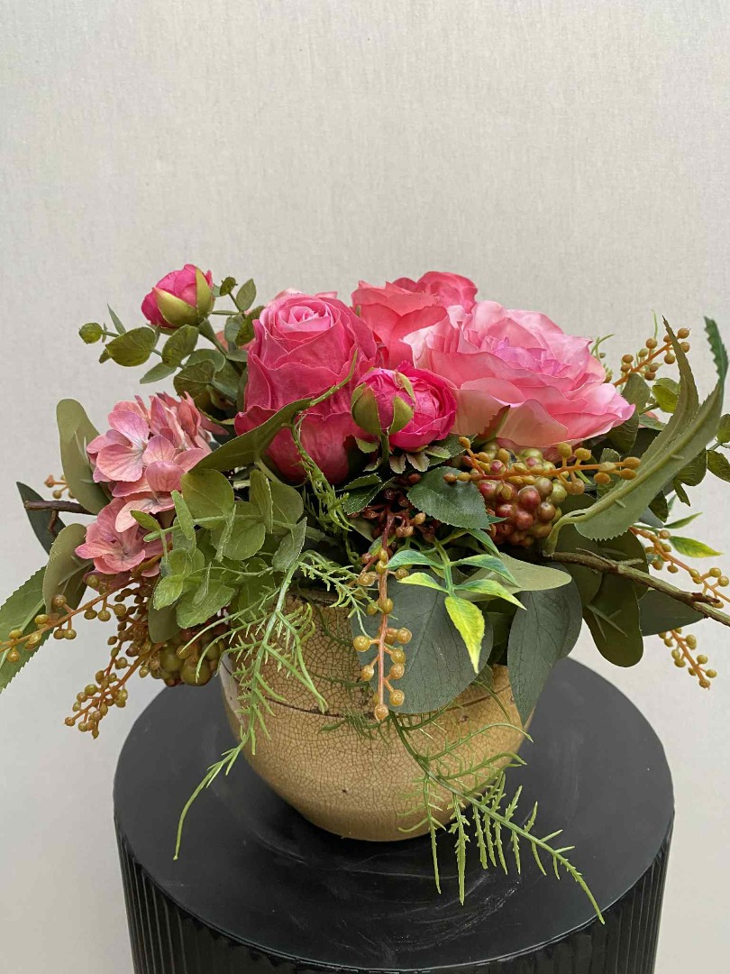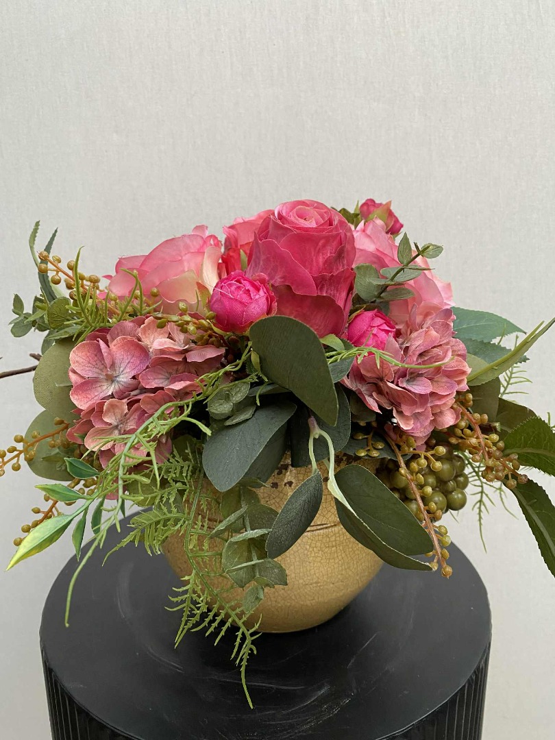 Dit fraaie Bloemstuk is volledig van zijde bloemen gemaakt. Onze bloemstukken worden in eigen atelier gemaakt. Iedere bloemstuk is handwerk.