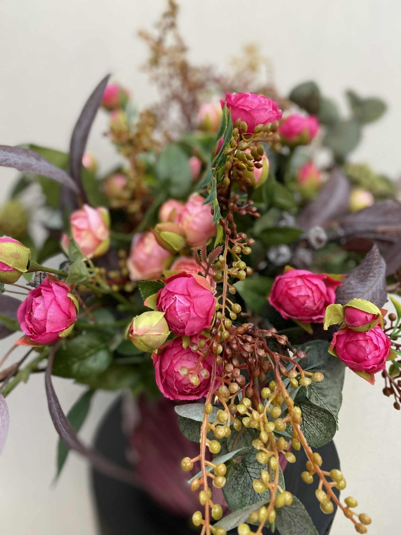 Dit fraaie Bloemstuk is volledig van zijde bloemen gemaakt. Onze bloemstukken worden in eigen atelier gemaakt. Iedere bloemstuk is handwerk.
