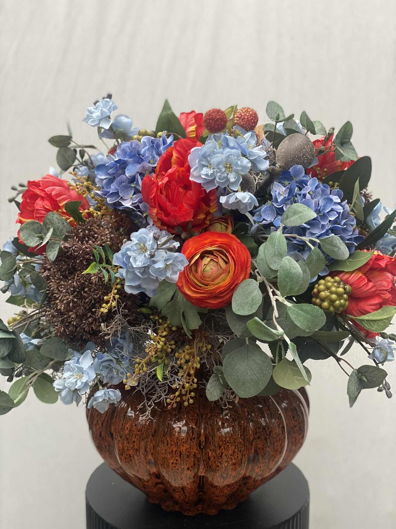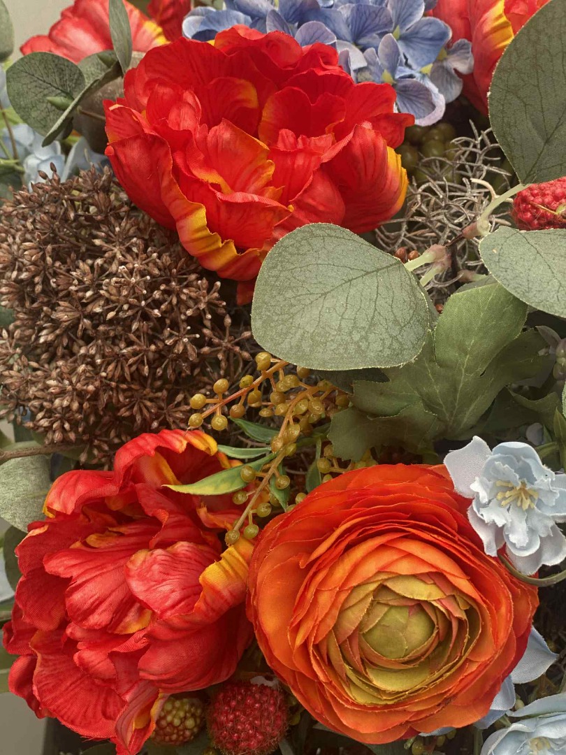 Dit fraaie Bloemstuk is volledig van zijden bloemen gemaakt. Onze bloemstukken worden in eigen atelier gemaakt. Iedere bloemstuk is handwerk.