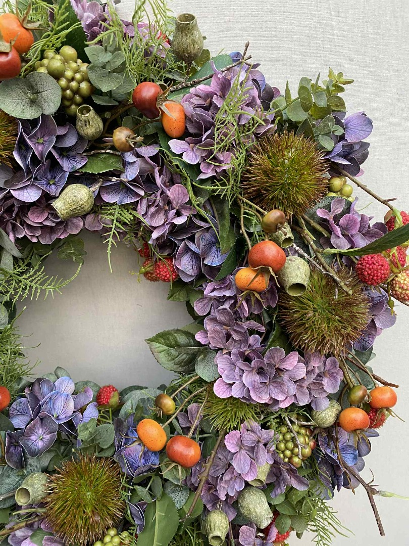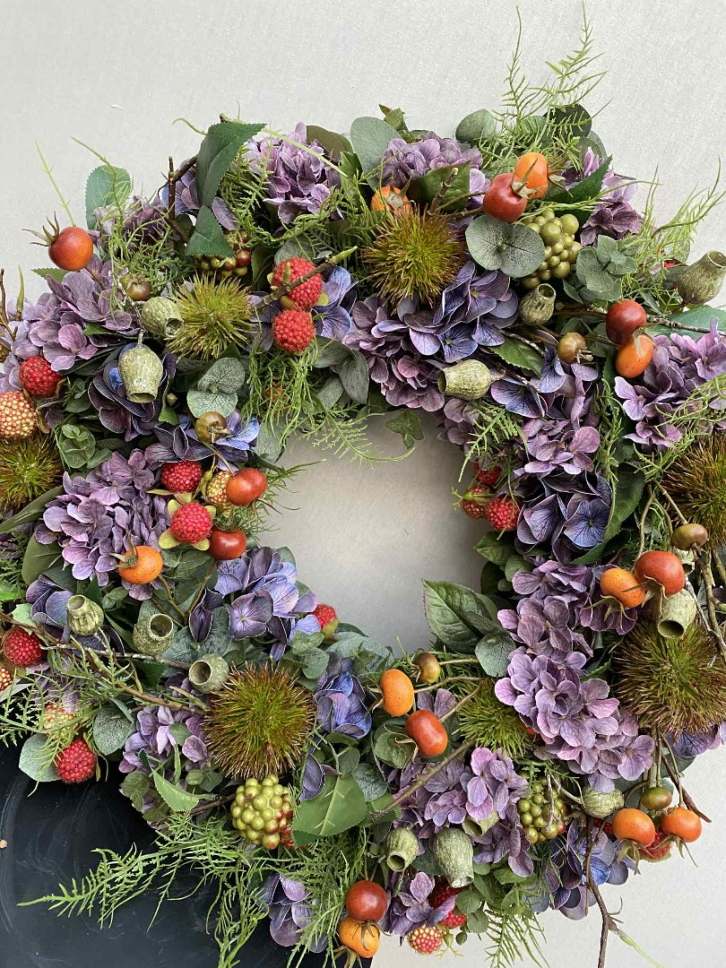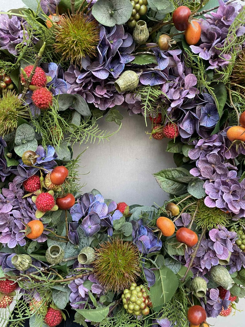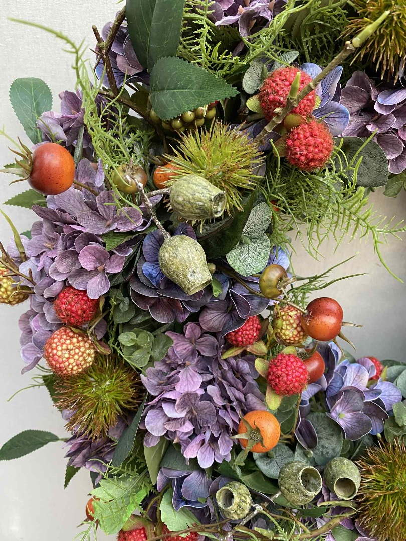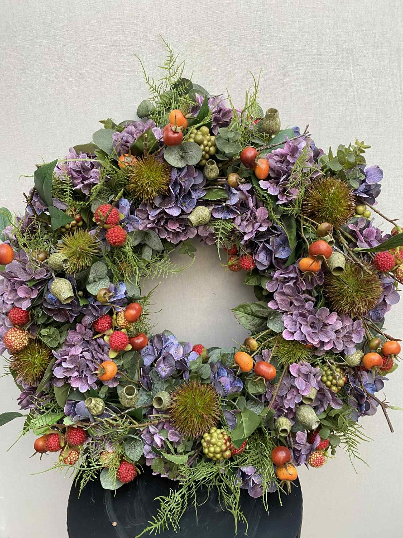 Deze fraaie krans is van zijde bloemen gemaakt. Onze bloemstukken worden in eigen atelier gemaakt. Iedere bloemstuk is handwerk.