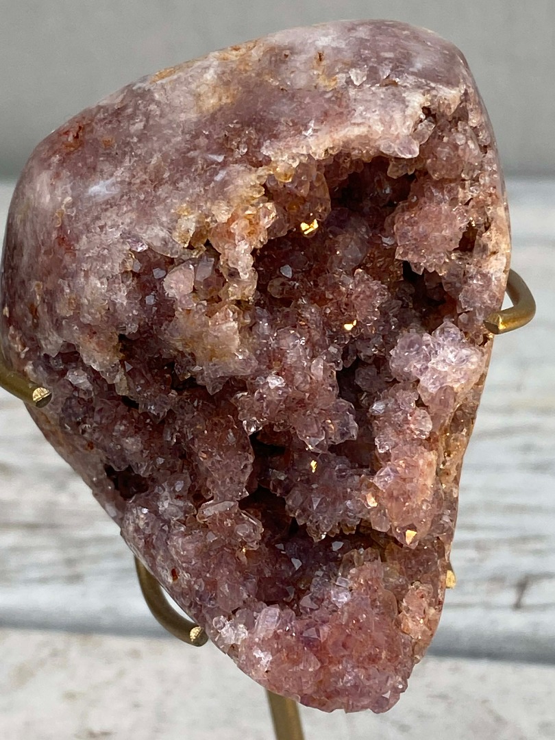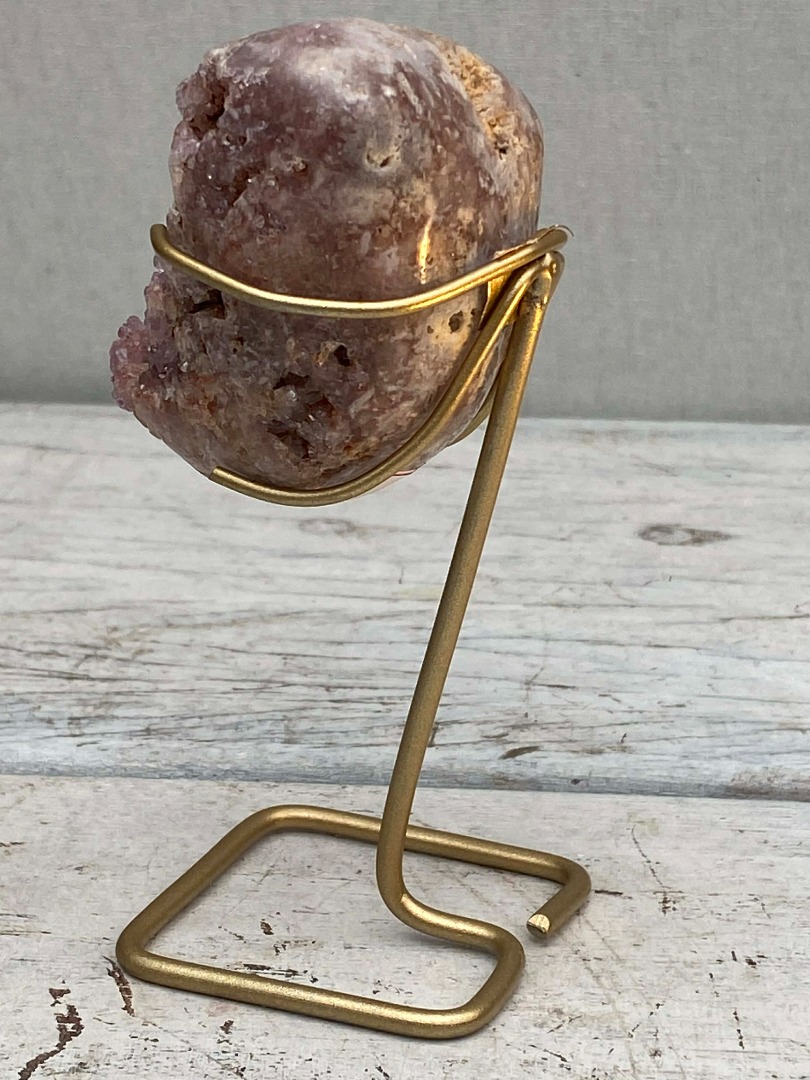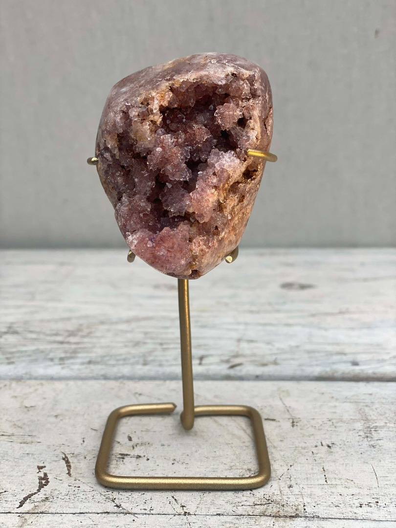 Roze Amethist. (zeldzame variëteit) Gemonteerd op een metalen standaard