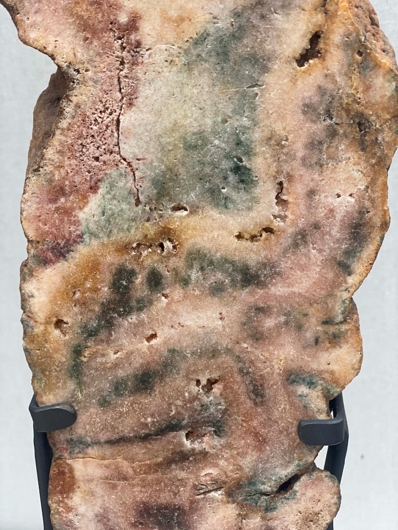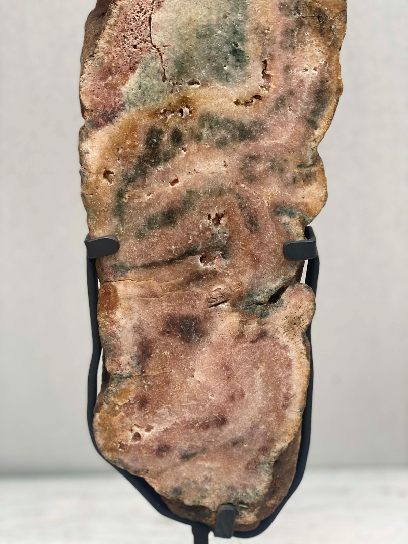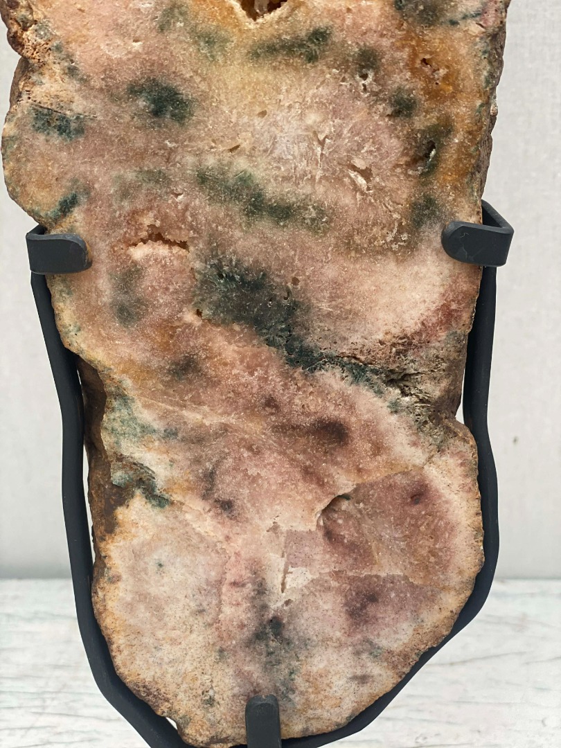 Roze Amethist. (zeldzame variëteit) Gemonteerd op een metalen standaard