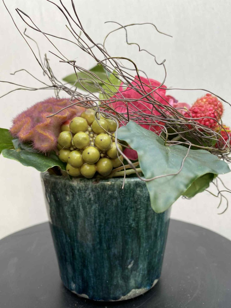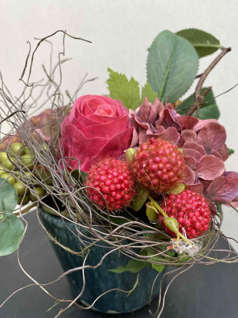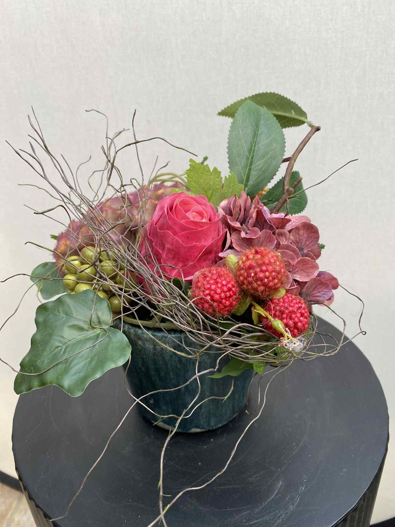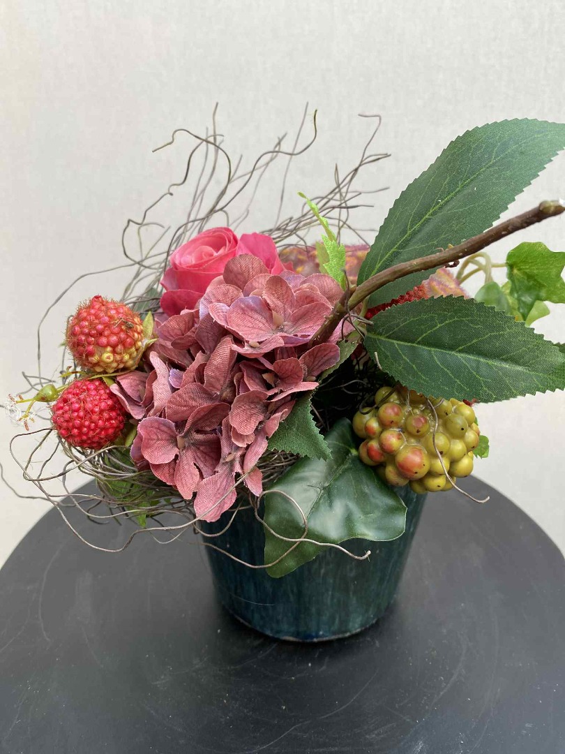 Dit fraaie Bloemstuk is volledig van zijde bloemen gemaakt. Onze bloemstukken worden in eigen atelier gemaakt. Iedere bloemstuk is handwerk.
