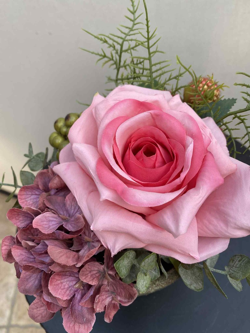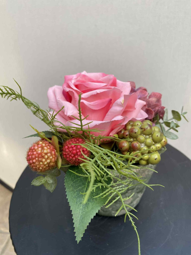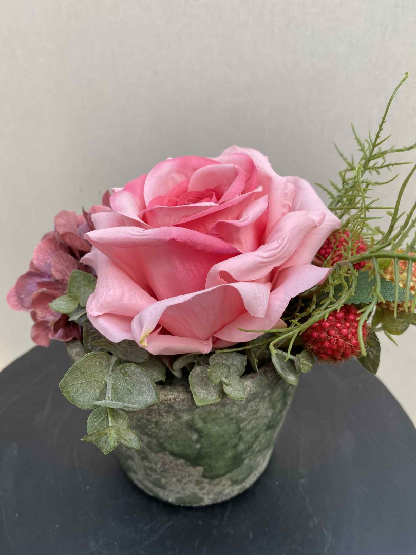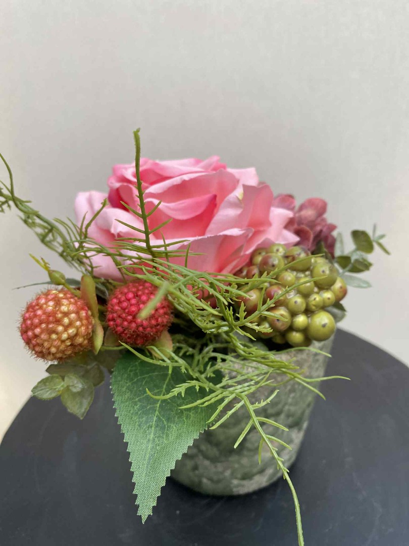 Dit fraaie Bloemstuk is volledig van zijde bloemen gemaakt. Onze bloemstukken worden in eigen atelier gemaakt. Iedere bloemstuk is handwerk.