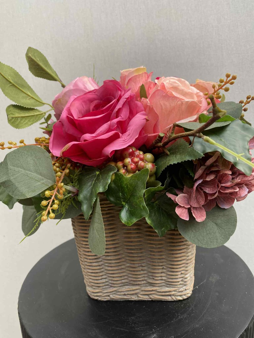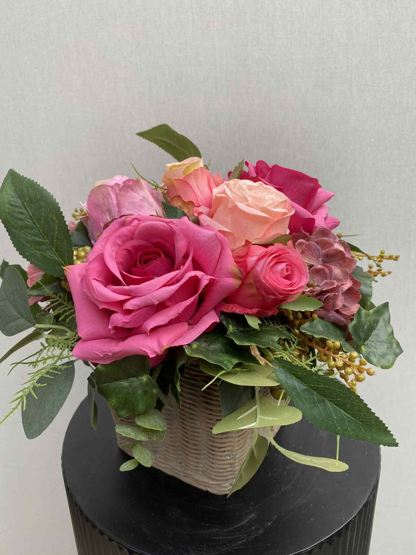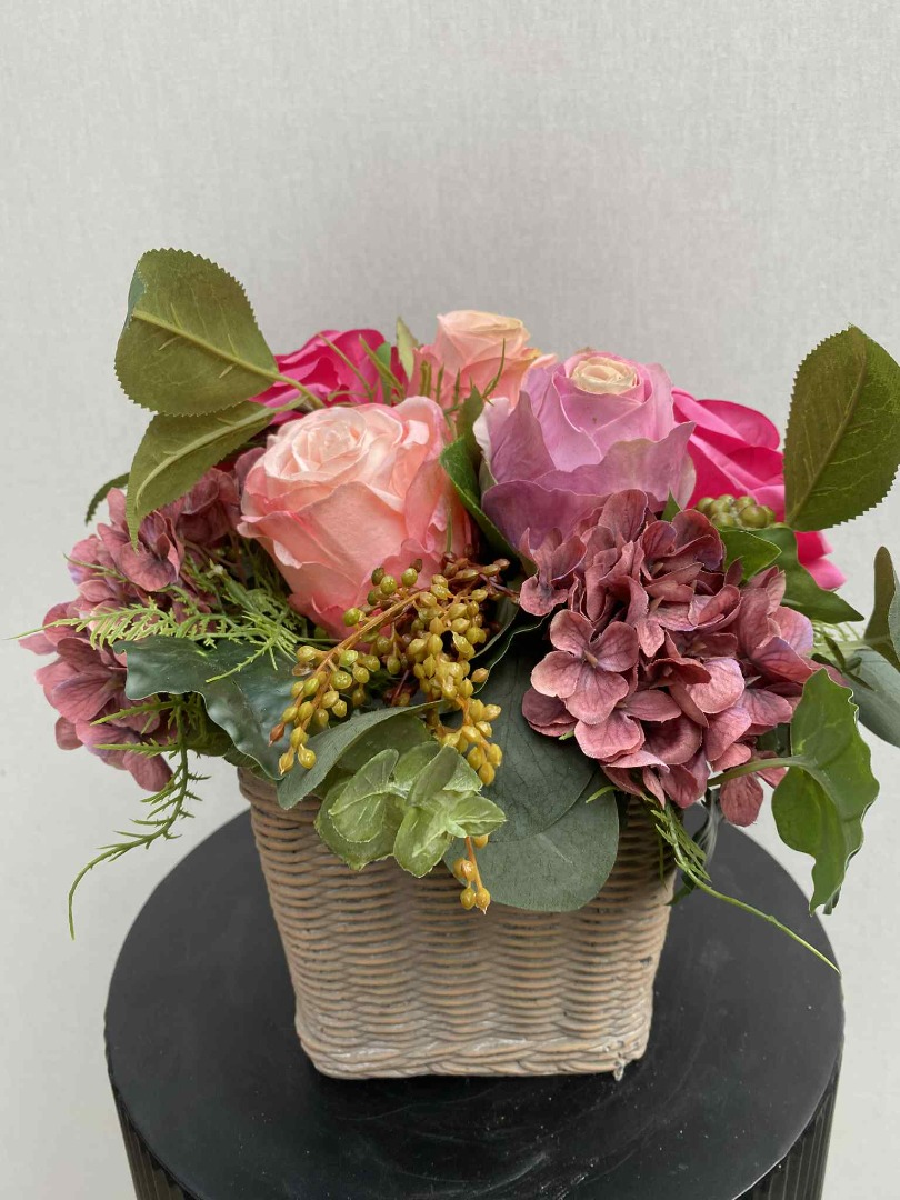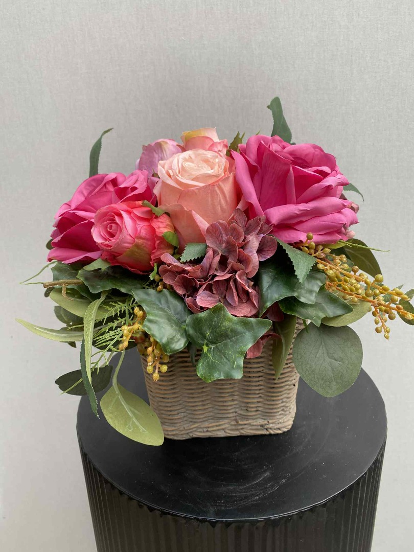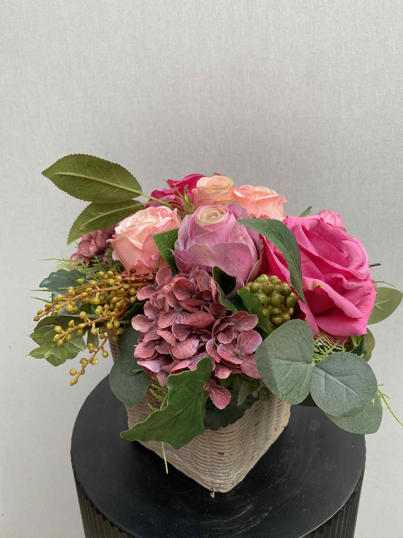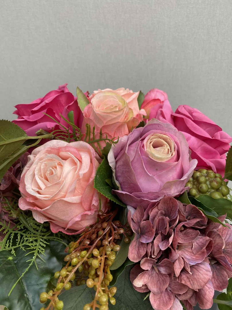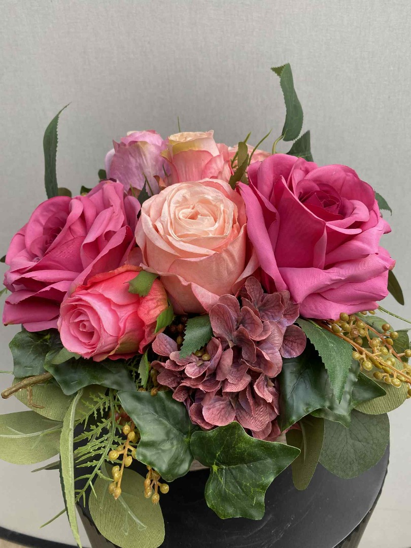 Dit fraaie Bloemstuk is volledig van zijde bloemen gemaakt. Onze bloemstukken worden in eigen atelier gemaakt. Iedere bloemstuk is handwerk.
