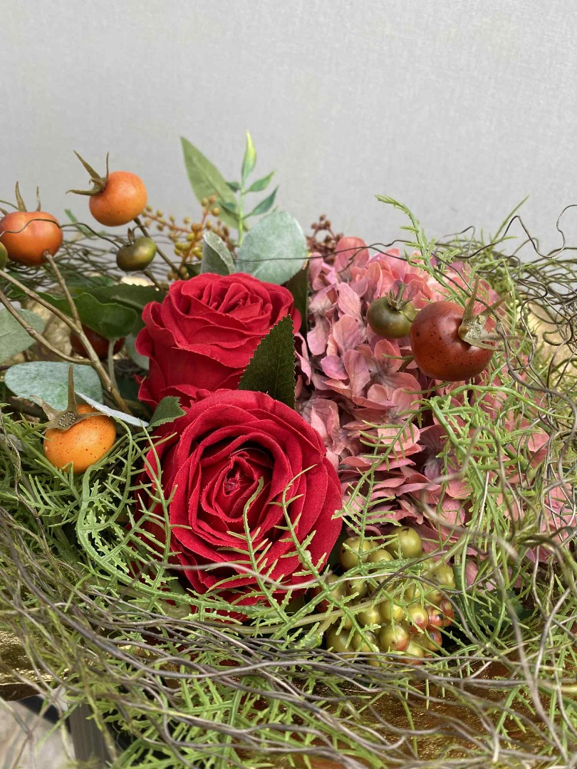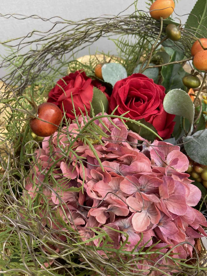 Dit fraaie Bloemstuk is volledig van zijde bloemen gemaakt. Onze bloemstukken worden in eigen atelier gemaakt. Iedere bloemstuk is handwerk.