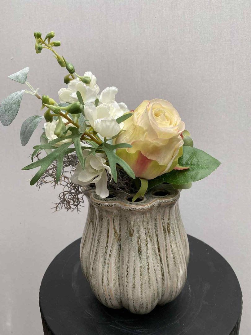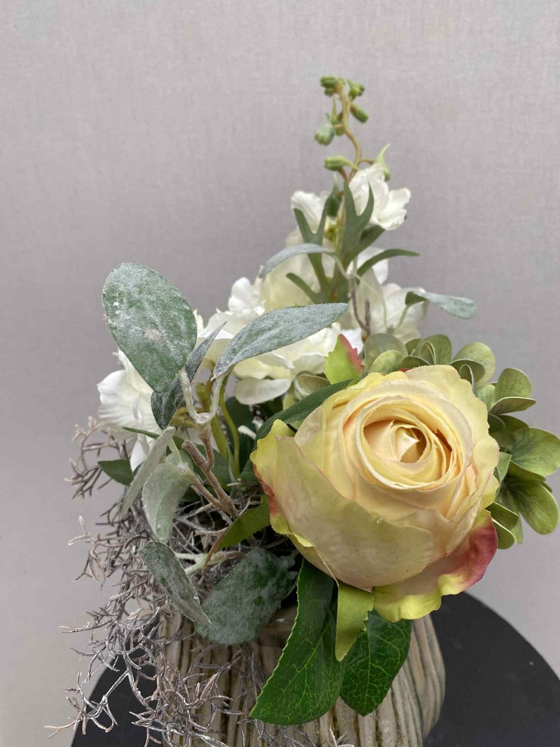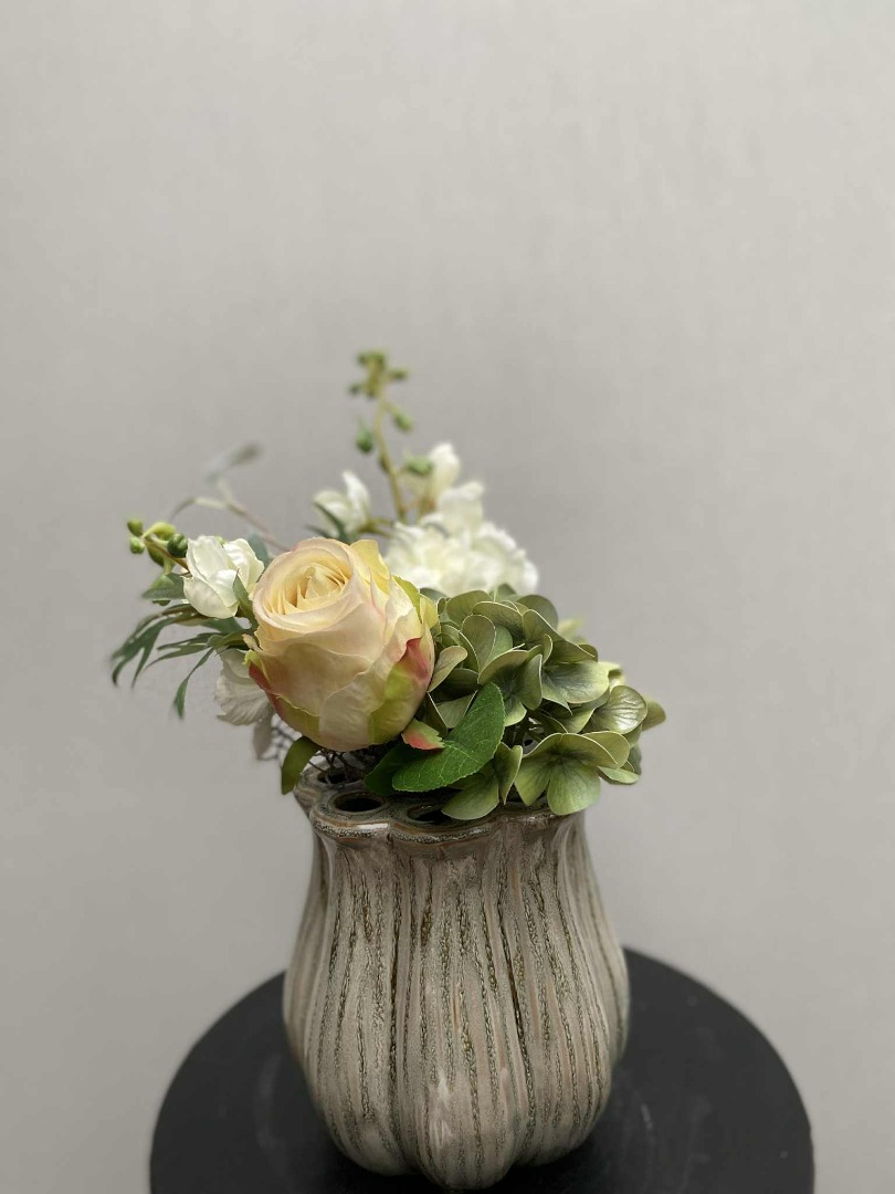 Dit fraaie Bloemstuk is volledig van zijde bloemen gemaakt. Onze bloemstukken worden in eigen atelier gemaakt. Iedere bloemstuk is handwerk.